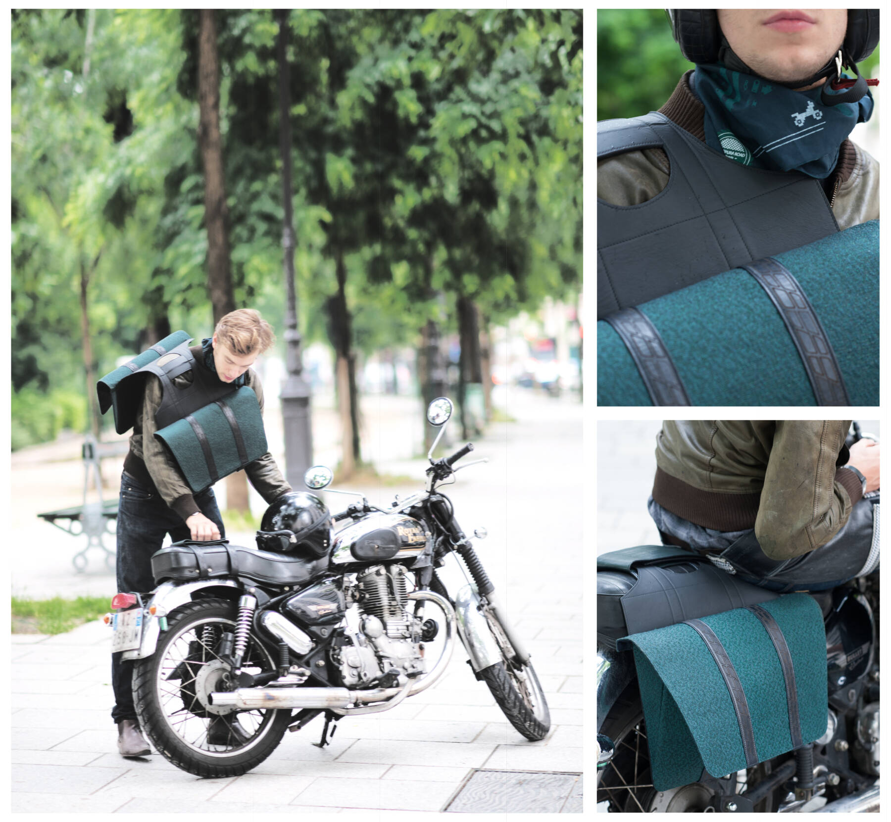 Diplômée de l’Ensci - Les Ateliers, Céline Thibault a croisé le monde de la moto à travers les Royal Enfield lors d’un périple étudiant en Inde. En rentrant à Paris, souhaitant retrouver cet univers, elle a eu la chance d’être accueillie par des passionnés qui lui ont transmis l’amour de la mécanique et de la culture néo-rétro. De cette expérience, elle en a fait ce projet axé sur le milieu motard distingué. Pour ses collections de bagages et foulards elle s’est entourée de partenaires basés à Courpière, Mazamet et Lyon dans le but de préserver les savoir-faire français.