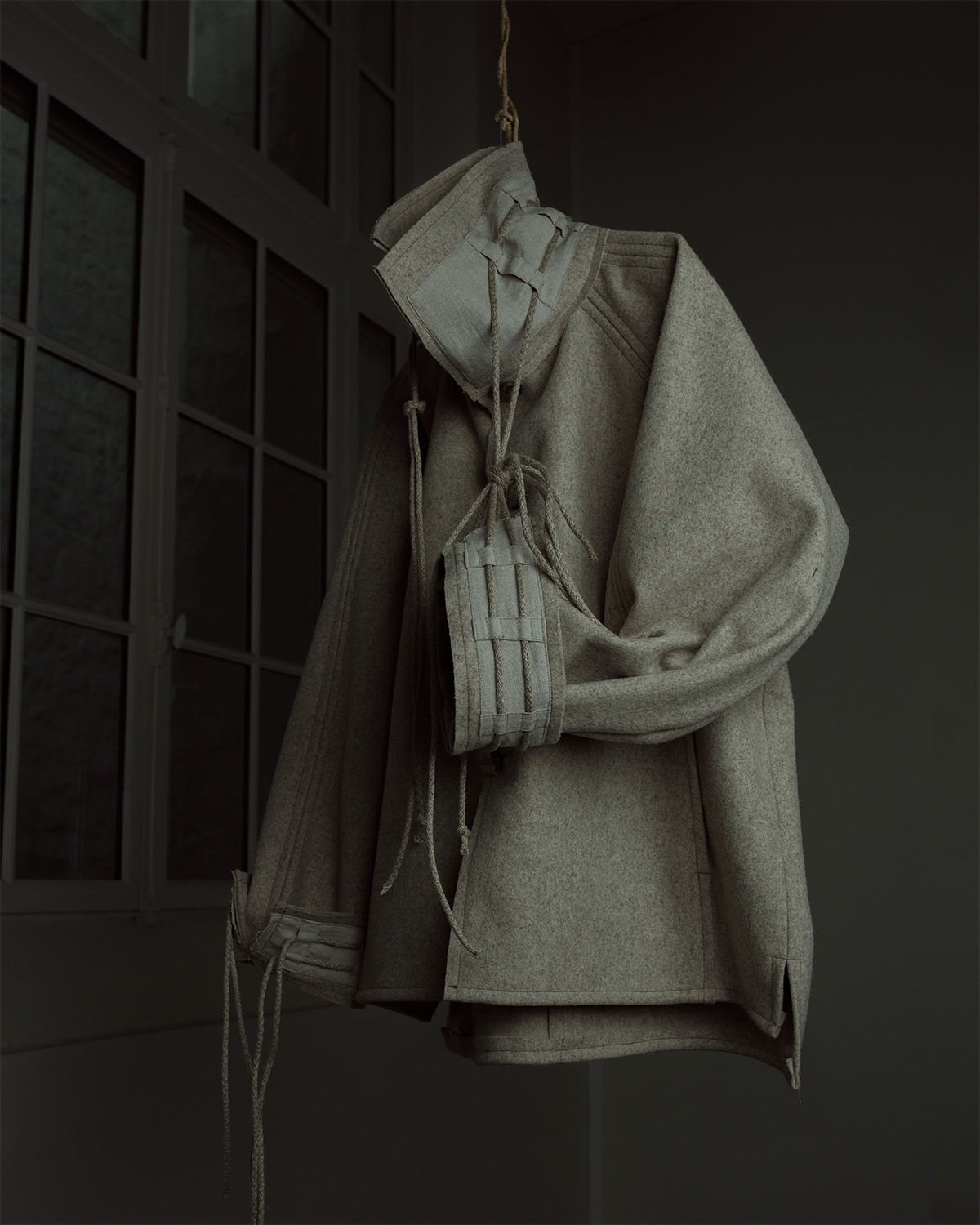 Veste à lien. Burel, toile de lin, tricotine de lin, boutons en corne de bélier. © Maison Douillet