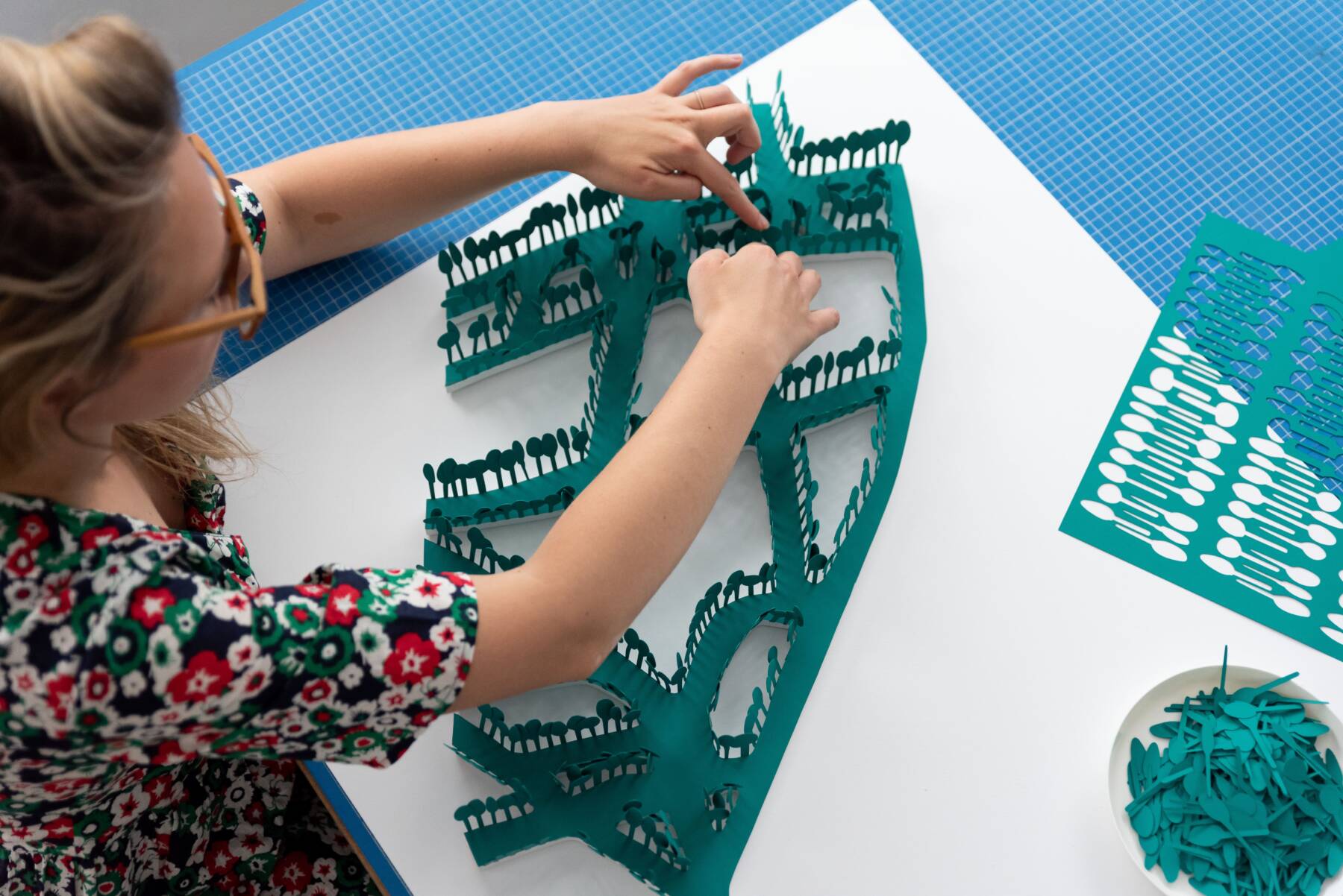 Aline Houdé-Diebolt est passionnée par la couleur, qu’elle manie avec dynamisme, et restitue grâce au papier. Toujours pensée en volume, elle programme la découpe au plotter pour obtenir des installations 3D toujours chatoyantes et où elle démontre son talent d’anticipation et de visualisation dans l’espace.